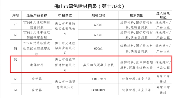 佛山綠色建材目錄-第52項 恒益環(huán)保建材公司蒸壓加氣混凝土砌塊