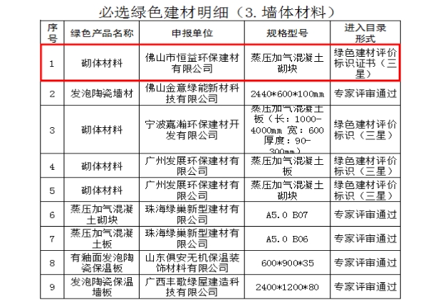 4月28日,恒益環(huán)保建材順利通過《佛山市綠色建材目錄》評審,標(biāo)志著公司生產(chǎn)的蒸壓加氣混凝土砌塊符合佛山氣候特點、建筑特點的建材標(biāo)準(zhǔn)。